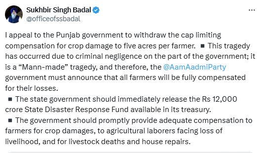 ਇੱਥੇ ਜਾਰੀ ਇੱਕ ਬਿਆਨ ਵਿੱਚ, ਸ਼੍ਰੋਮਣੀ ਅਕਾਲੀ ਦਲ ਦੇ ਪ੍ਰਧਾਨ ਨੇ ਕਿਹਾ ਕਿ ਇਹ ਹੈਰਾਨੀ ਵਾਲੀ ਗੱਲ ਹੈ ਕਿ ਮੁੱਖ ਮੰਤਰੀ ਨੇ ਪਹਿਲਾਂ ਬੱਕਰੀਆਂ ਅਤੇ ਮੁਰਗੀਆਂ ਲਈ ਮੁਆਵਜ਼ੇ ਦਾ ਐਲਾਨ ਕੀਤਾ ਸੀ, ਪਰ ਹੁਣ ਸਿਰਫ਼ 20,000 ਰੁਪਏ ਪ੍ਰਤੀ ਏਕੜ ਦੀ ਪੇਸ਼ਕਸ਼ ਕਰ ਰਹੇ ਹਨ, ਜਿਸ ਵਿੱਚ ਹਰੇਕ ਕਿਸਾਨ ਲਈ 5 ਏਕੜ ਦੀ ਸੀਮਾ ਹੈ। ਉਨ੍ਹਾਂ ਜ਼ੋਰ ਦੇ ਕੇ ਕਿਹਾ ਕਿ ਜੇਕਰ ਕਿਸਾਨਾਂ ਨੂੰ ਢੁਕਵਾਂ ਮੁਆਵਜ਼ਾ ਨਹੀਂ ਮਿਲਦਾ, ਤਾਂ ਸੂਬੇ ਵਿੱਚ ਖੇਤੀਬਾੜੀ ਸੰਕਟ ਪੈਦਾ ਹੋ ਜਾਵੇਗਾ। ਉਨ੍ਹਾਂ ਕਿਹਾ ਕਿ ਆਮ ਆਦਮੀ ਪਾਰਟੀ (ਆਪ) ਸਰਕਾਰ ਨੂੰ ਸੂਬੇ ਵਿੱਚ ਹੜ੍ਹਾਂ ਕਾਰਨ ਹੋਏ ਫਸਲਾਂ ਦੇ ਨੁਕਸਾਨ ਲਈ ਤੁਰੰਤ 50,000 ਰੁਪਏ ਪ੍ਰਤੀ ਏਕੜ ਦੇ ਮੁਆਵਜ਼ੇ ਦਾ ਐਲਾਨ ਕਰਨਾ ਚਾਹੀਦਾ ਹੈ।
