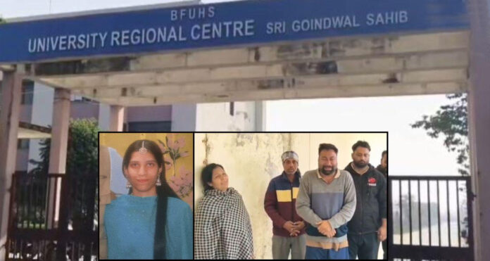 ਬਾਬਾ ਫਰੀਦ ਯੂਨੀਵਰਸਿਟੀ ਰੀਜਨਲ ਸੈਂਟਰ, ਗੋਇੰਦਵਾਲ ਸਾਹਿਬ ਵਿਖੇ ਬੀ.ਐਸ.ਸੀ. ਨਰਸਿੰਗ ਦੀ ਡਿਗਰੀ ਕਰ ਰਹੀ ਇੱਕ ਵਿਦਿਆਰਥਣ ਨੇ ਯੂਨੀਵਰਸਿਟੀ ਸਟਾਫ ਵੱਲੋਂ ਕਥਿਤ ਤੌਰ ‘ਤੇ ਕੀਤੇ ਗਏ ਦੁਰਵਿਵਹਾਰ ਕਾਰਨ ਖੁਦਕੁਸ਼ੀ ਕਰ ਲਈ ਹੈ।