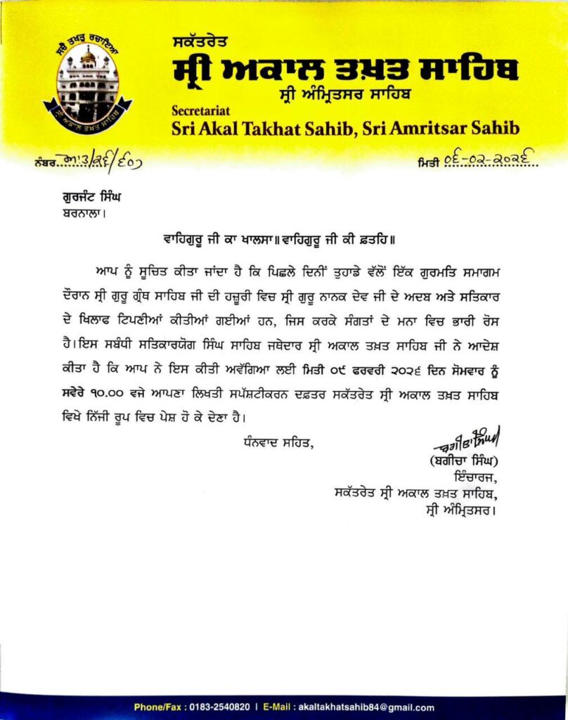 ਸ੍ਰੀ ਅਕਾਲ ਤਖ਼ਤ ਸਾਹਿਬ ਦੇ ਜਥੇਦਾਰ ਸਿੰਘ ਸਾਹਿਬ ਗਿਆਨੀ ਕੁਲਦੀਪ ਸਿੰਘ ਗੜਗੱਜ ਦੇ ਹੁਕਮਾਂ ਅਨੁਸਾਰ, ਬਰਨਾਲਾ ਦੇ ਗੁਰਜੰਟ ਸਿੰਘ ਨੂੰ 9 ਫਰਵਰੀ, 2026 ਨੂੰ ਸਵੇਰੇ 10:00 ਵਜੇ, ਹਾਲ ਹੀ ਵਿੱਚ ਹੋਏ ਇੱਕ ਗੁਰਮਤਿ ਸਮਾਗਮ ਦੌਰਾਨ ਸ੍ਰੀ ਗੁਰੂ ਗ੍ਰੰਥ ਸਾਹਿਬ ਜੀ ਦੀ ਹਜ਼ੂਰੀ ਵਿੱਚ ਸ੍ਰੀ ਗੁਰੂ ਨਾਨਕ ਦੇਵ ਜੀ ਦੇ ਸਤਿਕਾਰ ਅਤੇ ਮਾਣ-ਸਨਮਾਨ ਪ੍ਰਤੀ ਅਪਮਾਨਜਨਕ ਟਿੱਪਣੀਆਂ ਕਰਨ ਲਈ ਆਪਣਾ ਲਿਖਤੀ ਸਪੱਸ਼ਟੀਕਰਨ ਪੇਸ਼ ਕਰਨ ਲਈ ਤਲਬ ਕੀਤਾ ਗਿਆ ਹੈ।